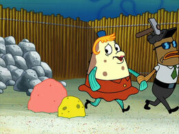 Meanwhile, SpongeBob is depressed that Mrs. Puff is in jail and Patrick tells him that information technology is SpongeBob's fault. The duo sets out to gratuitous her from jail. Showtime, they try to rob the "1st Nautical Depository financial institution" in order to go arrested themselves, but SpongeBob gets wrapped up in the bureaucratic niceties of banking and forgets they are trying to commit a offense. Next, they disguise themselves as rocks that the prisoners blast equally labor. They try to communicate with Mrs. Puff, who calls the guards, but they dismiss her conversation with two rocks as a hallucination and movement her to kitchen duty. SpongeBob and Patrick are then smashed by some other inmate, costing them their deposit on the costumes. And then they hibernate in a vat of chili in the deli and offering to assistance Mrs. Puff escape through it, but she explains to them that she likes it in prison, which SpongeBob refuses to believe. He worries that Mrs. Puff is completely institutionalized in prison and he needs to get her out. In an effort to coax her, SpongeBob tells Mrs. Puff if she can escape, he will stay subsequently school and decorate the entire classroom, but Mrs. Puff refuses. She calls for the prison house guards again and is reassigned once more after the prison house guards believe that Mrs. Puff is going crazy.